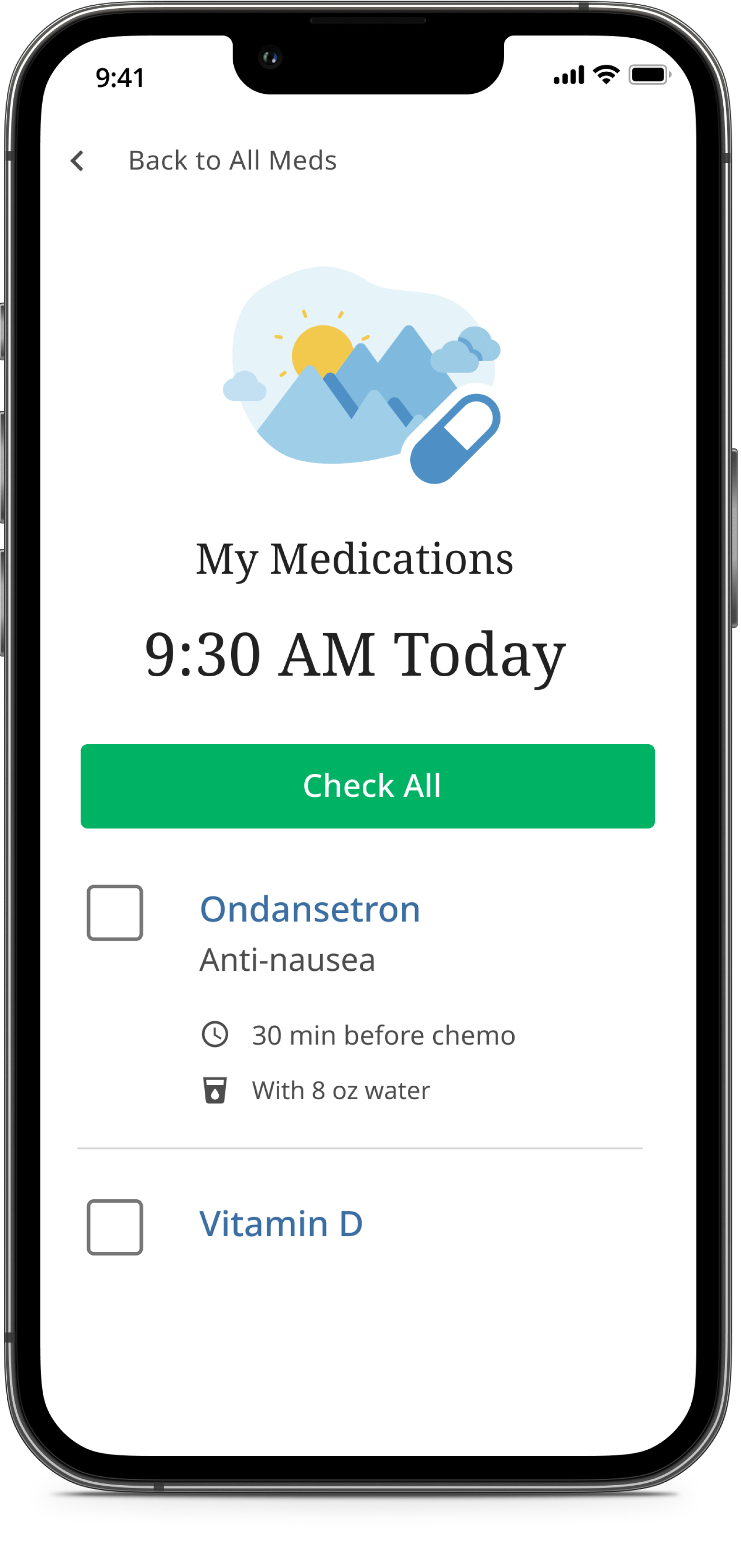 To help users focus in on what meds they need to take in a given moment, I created illustrations that represented the times of day. As the day passed, the illustrations also changed.